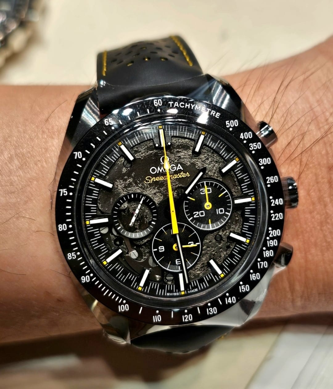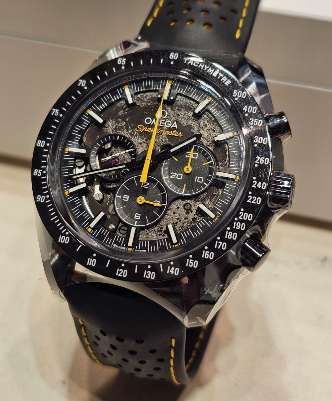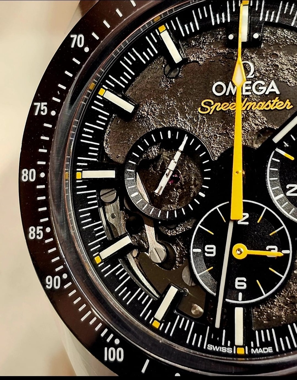 В новой модели, новые даже корпус и ремешок, не говоря уже о других деталях. Раз уж зашла об этом речь, позвольте мне поделиться информацией об этом. Новый Аполлон-8 OMEGA представляет новую версию Speedmaster Apollo 8. Они не только оснащены новым калибром (3869) и сертифицированы Master Chronometer, но и элементы дизайна часов имеют гораздо более тонкий уровень детализации чем предыдущая версия. Новый механизм OMEGA 3869 В часах используется новый калибр 3869. Он основан на калибре 3861, но имеет изображение лунной поверхности, полученное методом лазерной абляции. На лицевой стороне вы увидите ту часть Луны, которую видите с Земли в ночное время. Однако на обратной стороне изображена «темная сторона» Луны, которую астронавты впервые увидели в 1968 году. Вы заметите, что новая лунная поверхность механизма демонстрирует больше деталей, чем его предшественник. Это связано с тем, что лазерная абляция стала более продвинутой и теперь использует более высокое разрешение. Кроме того, некоторые детали, такие как кратеры, стали темнее из-за лазерной абляции латунного материала перед процессом лакирования. Если мы остановимся на циферблате на мгновение, мы также увидим, что пространство под циферблатом на 9 часов глубже, чем у его предшественника. Это придает новой маленькой секундной стрелке больше заметности. Винты менее заметны Помимо новой субсекундной стрелки, изменились минутная стрелка и желтая (лаковая) секундная стрелка хронографа - теперь они куполообразные. Вы также увидите, что обработанная лазером опорная пластина выглядит по-другому, поскольку механизм тоже изменился. Видимые винты находятся в менее заметных местах. Алюминиевый скелетонированный циферблат остался прежним, за исключением часовых меток. Теперь они скошены с двумя гранями. Логотипы Omega и Speedmaster также выполнены из белого и желтого лака. Новый стиль корпуса для новой Dark Side of the Moon Apollo 8 Керамический корпус диаметром 44,25 мм также имеет новую форму. Как и текущие модели Speedmaster Professional диаметром 42 мм, новая версия Apollo 8 имеет форму, основанную на четвертом поколении Speedmasters (105.012). Толщина этого корпуса составляет 12,97 мм, а расстояние от выступа до выступа составляет 50 мм. С расстоянием между ушками 50 мм они ненамного больше классических Moonwatch. Безель изготовлен из отдельного блока керамики и теперь имеет тахиметрическую шкалу из белой эмали (Grand Feu), тогда как раньше она была выполнена из люминесцентного покрытия Super-LumiNova. То же самое относится и к логотипу Omega на заводной головке, которая теперь также выполнена из белой эмали вместо Super-LumiNova. Цитата пилота командного модуля Аполлона-8 Джима Ловелла Повернув часы, мы видим на механизме темную сторону поверхности Луны. Если предыдущую версию нужно было перевернуть по вертикали, чтобы увидеть лунную поверхность с правильной точки зрения, то в новой версии на базе калибра 3869 ее нужно перевернуть по горизонтали. Как и у предшественника, на черной керамической задней крышке имеется та же цитата пилота командного модуля Аполлона-8 Джима Ловелла: «Увидимся на другой стороне». Однако теперь он черный на черном, с достаточным контрастом, чтобы его можно было прочитать. Новый каучуковый ремешок и раскладывающаяся застежка Перфорированный черный ремешок с желтой внутренней частью теперь полностью выполнен из каучука. Внешняя часть и подкладка — отдельные ча