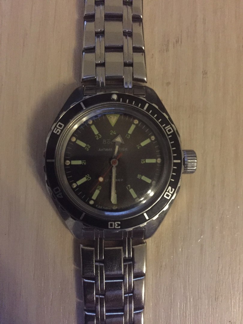 Имею часы Восток-Амфибия. Хотелось бы узнать год производства. Серийный номер: 649232. Есть некоторые изменения: - На безеле стерлась краска, подкрашивал сам; - Фосфор из стрелочек осыпался; - Ремешок-браслет заменен на кожаный. |