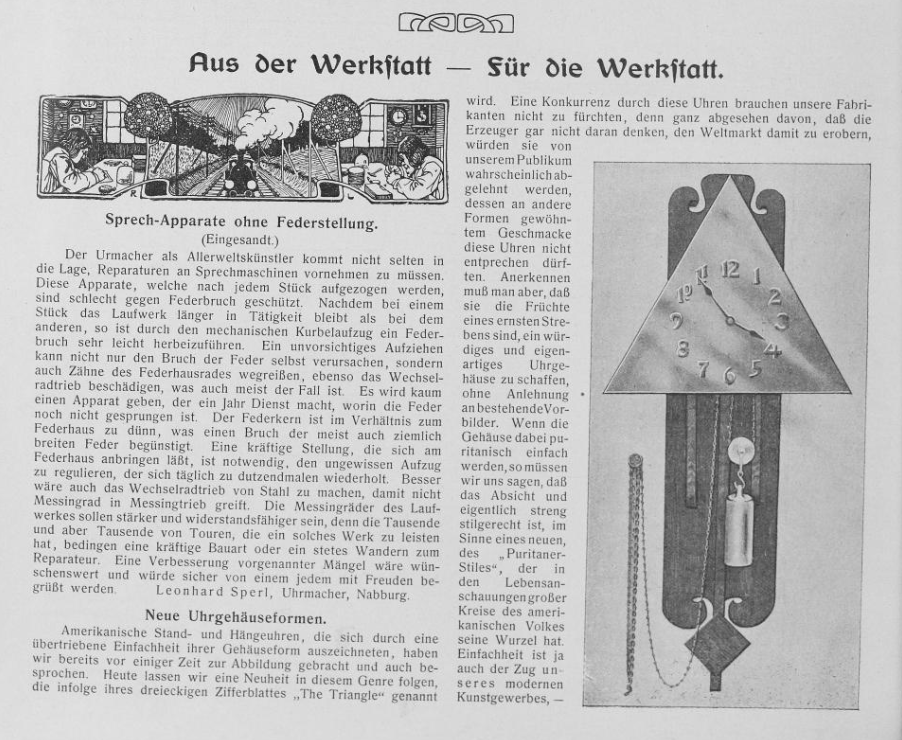 Косвенным доказательством является лейпцигский часовой журнал, несколько томов которого есть в оцифрованном виде https://digital.slub-dresden.de/werk...982_mets.xml/1 Качество сканирования не очень хорошее, но при желании можно запихивать статьи в переводчик. Среди частых имён в статьях и рекламе на страницах журнала: * Etzold & Popitz, * Berger & Wurker, * Bernard Paschen, * Kraft Behrens. а также мюнхенские и берлинские фирмы. ------- ДОБАВЛЕНО ЧЕРЕЗ 16 МИН -------- Вот иллюстрации из журнала за 1900-ый год: Вложение 3823029 Вложение 3823030 Вложение 3823031 Вложение 3823032 Вложение 3823033 Вложение 3823034 Вложение 3823035 Вложение 3823036 Вложение 3823037 ------- ДОБАВЛЕНО ЧЕРЕЗ 10 МИН -------- 1901-ый: Вложение 3823053 Вложение 3823054 Вложение 3823055 Вложение 3823056 Вложение 3823057 |