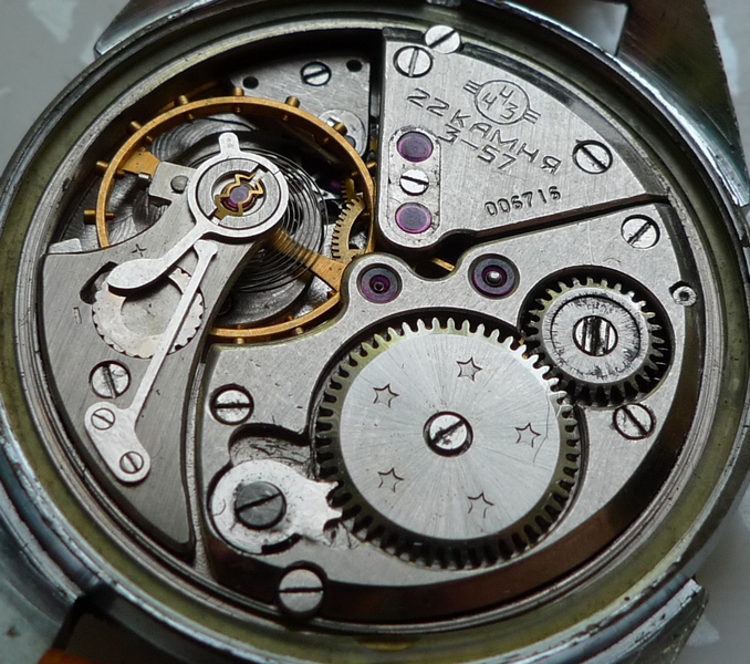 Очень хорошо прослеживается один и тот же шрифт для "22 камня" и серийного номера. На всех экземплярах из этого форума с 21 камнем от 57-58 года и на 3-59 с 22 камня от watchseek он одинаковый. Дополнительно замечу, что окраска звезд на заводном колесе на прецизионных механизмах конца 50х уже голубая, как и на желтых начала 60х. На Вашем фото, как и на других 2809 с Волны или или обычного Востока, шрифт заметно отличается. Так что на мой взгляд, шансов что у Вас не 2809 с Волны, а прецизионный, не очень много. Вот мне только что прислали фото другого такого механизма с датой: https://docs.google.com/leaf?id=0BxP...4Y2I1&hl=en_GB Замечательно, что циферблат даже не помечен, явно заготовка для ремонта. https://docs.google.com/leaf?id=0BxP...4OWZk&hl=en_GB |