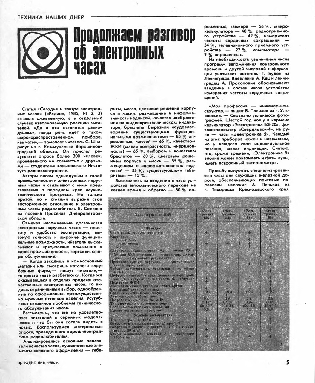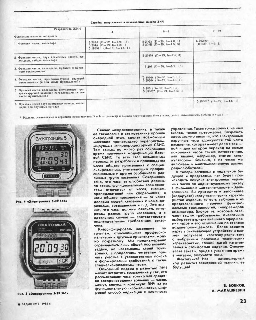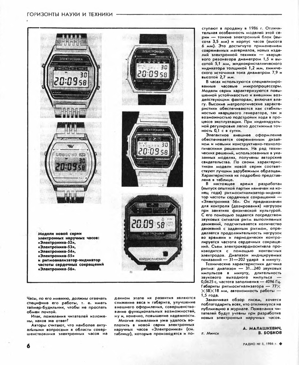 Правда, мне для этого пришлось не слабо попыхтеть.;) Поиск в интернете ничего не дал, т.е. абсолютно ничего.:( Но в один прекрасный момент я вспомнил, что когда-то во второй половине 80-х годов мне попадались статьи в журнале "Радио" об электронных часах, их настоящем и будущем. Помню, что все перспективы, которые обрисовывали авторы этих статей, произвели на меня очень сильное впечатление. Были представлены настолько революционные модели, что казались, с одной стороны, чем-то несбытотчным и отчасти фантастическим (те, кто родился и вырос в СССР, надеюсь, меня поймут), а, с другой стороны, я думал, что вот вернусь из Армии, тогда все эти часы уже будут в продаже, и я смогу купить, если не все, то большинство их понравившихся моделей. Но, к сожалению, этого не случилось. Т.е. из Армии-то я благополучно вернулся,:) но некоторых моделей часов в продаже так и не появилось. Какие-то из них либо вообще не запустились в серию, либо выпускались настолько ограниченным количеством, что в свободной продаже их практически не было. Я тогда смог купить из всего современного модельного ряда лишь Электронику 55 (с модельным рядом 5х было как-то попроще). А столько надежд было... Ну ладно, что-то я отвлёкся. В общем, предлагаю вашему вниманию эти статьи, окунитесь в мир середины 80-х, мир энтузиазма, розового электронно-часового будущего, надежд и замечательных идей. Итак, "Сегодня и завтра электронных часов". Радио, №2, 1985, начало. Вложение 143157 Вложение 143158 Вложение 143159 Вложение 143161 Вложение 143160 "Сегодня и завтра электронных часов". Радио, №3, 1985, окончание. Вложение 143162 Вложение 143163 Тут опечаточка закралась. Часы №3 на первой картинке - это Электроника 5-29361, а не 5-29367. "Продолжаем разговор об электронных часах". Радио, №8, 1986. Вложение 143164 Вложение 143165 Ну что, уважаемый ss-stingray, узнали свой корпус от Электроники 5-29361? Вам осталось только лишь найти для него начинку;). Скажу лишь, что я таких часов живьём никогда не видел, да и 5-29358, с табель-календарём, тоже. Но, судя по тому, что корпус у Вас есть, значит эта модель всё-таки выпускалась и продавалась. P.S. Прочёл я эти статьи, и вновь до боли обидно мне стало за Державу нашу, некогда очень могучую. Получилось, как в известной революционной песне:" Мы всё разрушим, а затем..." Разрушить-то разрушили, не впервой. А вот "затем" ничего путного так и не построили. И, к сожалению, для нас - это обычная история. :( |