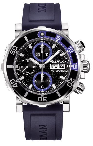 Новая модель Yachtman Chronograph от швейцарской часовой компании Paul Picot имеет круглый корпус из нержавеющей стали, диаметром 43 мм, толщиной 15 мм, водонепроницаемый до 200 метров, с 22-миллиметровым расстоянием между дужками. Защищенная завинчивающаяся заводная головка расположена на 3 часах. Вращающийся однонаправленный дайверский безель с черным или синим покрытием. Сапфировое стекло защищает циферблат черного или синего цвета, с накладными часовыми индексами, часовой и минутной стрелками, покрытыми белым люминесцентным составом.