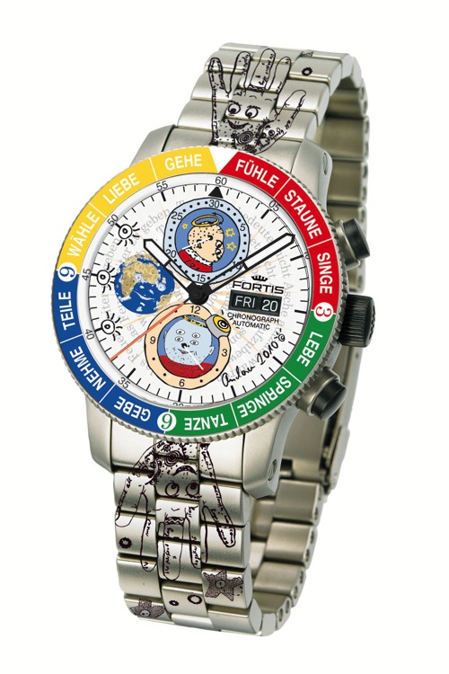 Тема старая, но имеет продолжение. Два года назад Фортис выпустил новую модель с рисунками того же дизайнера Андорра. Модель называется Эмоции, т.к. на безеле в зонах разного цвета написаны разные эмоции. Есть две версии этой модели с надписями на немецком и англиском языке.