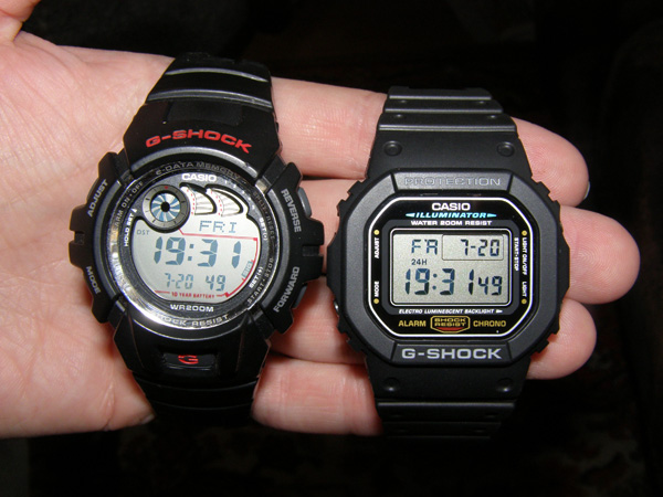 В связи с тем, что подарил сыну GA-100, созрел вопрос о необходимости :D приобретения новых Шоков. Прогуливаясь в Казани в магазине Парк-Хаус, очень удивился огромному выбору Касио. Быстро сравнив цены с инетом, приобрел классические DW-5600. Особенно порадовала подсветка, намного ярче, чем у таких же моделей с солнечной батарейкой.