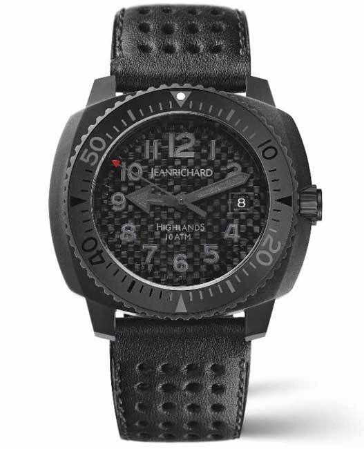 Новая модель Highlands от швейцарской часовой компании JeanRichard отличается корпусом из нержавеющей стали с пескоструйной обработкой. Длина последнего составляет 44,50 мм, ширина 40,00 мм, толщина 11,96 мм, водонепроницаемый до 100 метров. На торце защищенной завинчивающейся заводной головки, расположенной на 3 часах, имеется логотип бренда. Задняя крышка корпуса на четырех винтах. Вращающийся двунаправленный безель с зубчатым наружным краем. Сапфировое стекло с антибликовым покрытием защищает светло-зеленый люминесцентный циферблат с черными арабскими цифрами, а также с часовой и минутной стрелками, покрытыми люминесцентным составом.