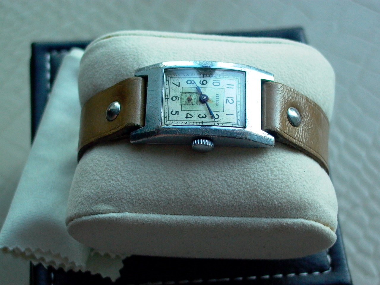 Однако отдельно продавались серебряные браслеты и ремешки трех видов. - ремешок неразрезной, продеваемый под ушко, заднюю крышку и второе ушко; - ремешок разрезной (как у Вас), с приложением – две "ручные" заклепки; - ремешок неразрезной, с кожаной "шайбой" размером, превышающим контур часов, изолирующий руку от прикосновения с задней крышкой часов; Тем не менее, сохранившийся у Вас ремешок имеет не меньшую ценность, чем сами часы! |