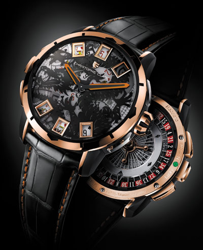 Независимая швейцарская часовая компания Christophe Claret, которая в прошлом году представила свою сенсационную "игровую" модель 21 Blackjack (о ней и ее технических характеристиках см. на нашем форуме здесь), проанонсировала выпуск новинки - Baccara Dragon, которая, кроме индикации времени, дает возможность владельцу играть в три игры (баккара, рулетка и кости). Она выпускается в двух вариантах: в розовом и в белом золоте и будет официально представлена на выставке Baselworld-2012.