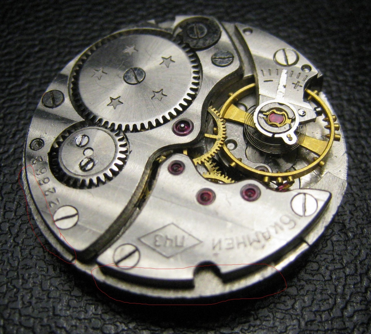 Механизм 2603 на фото - 100% оригинал. Я не раз писал, что отличий от Победовского много. Платины одинаковые, механизмы лезут во все корпуса, а вот циферблаты по диаметру разные бывают. В корпусах делается проточка соответствующего диаметра под циферблат, чтобы механизм был зафиксирован. Штатно такие механизмы крепятся двумя винтами в маленькие корпуса и двумя пружинными кольцами в большие, как и 2609.