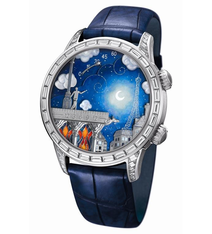 Ювелирный дом Van Cleef & Arpels на часовой выставке SIHH 2012 в Женеве представил новую сказочную коллекцию часов Poetic Wish. Эксклюзивные модели этой линии были созданы выдающимся часовщиком Жан-Марком Видеррехтом и мастером Домиником Бароном. Следует отметить, что их талант и безграничная фантазия воплотились в каждой модели коллекции. Видеррехт использовал передовые технологии для создания механизма, а Барон дополнил его не менее изощренным дизайном. Каждая модель этой коллекции уникальна: например, часы Lady Arpels Poetic представляют парижский пейзаж. Великолепная картина, изображенная на циферблате, сделана из перламутра и заключена в круглый корпус из белого золота, украшенный бриллиантами. Циферблат закреплен на ремешке из шелка жемчужно-серого цвета и натуральной кожи.