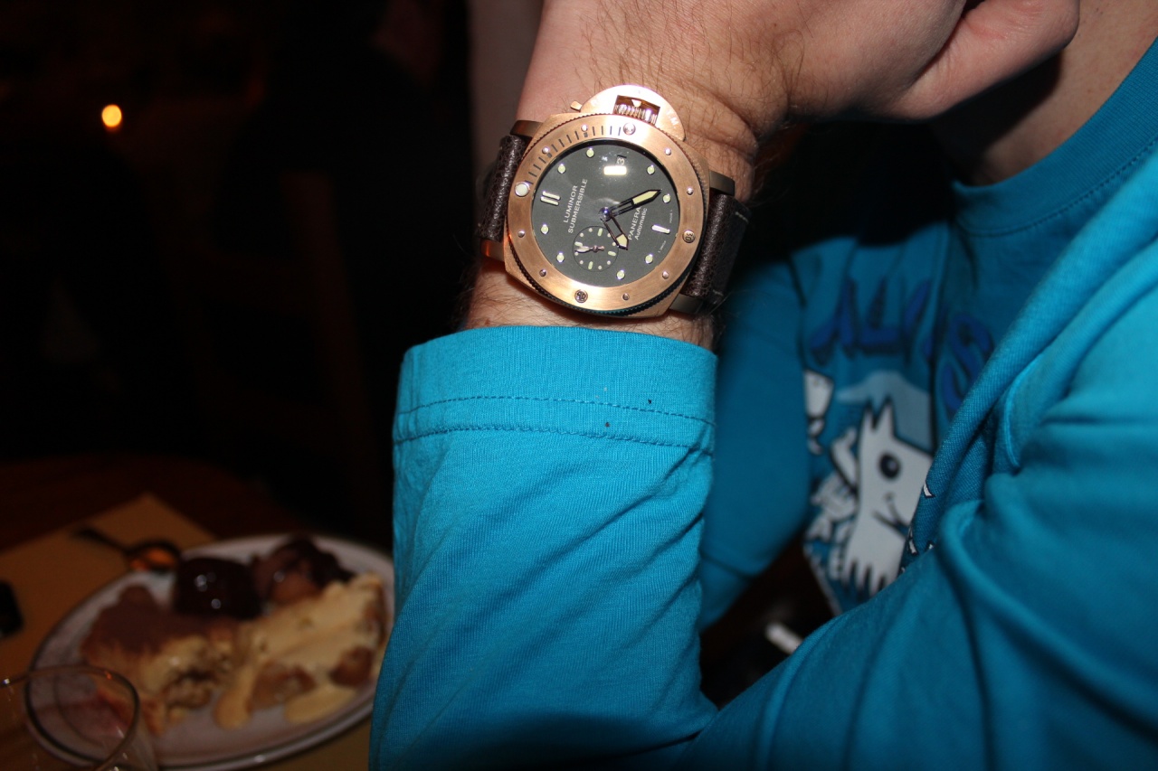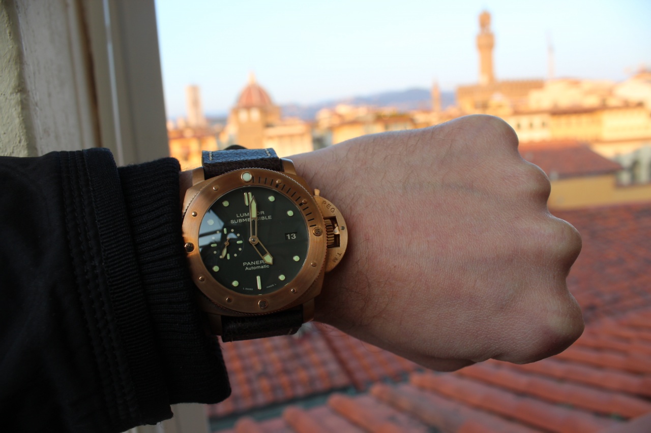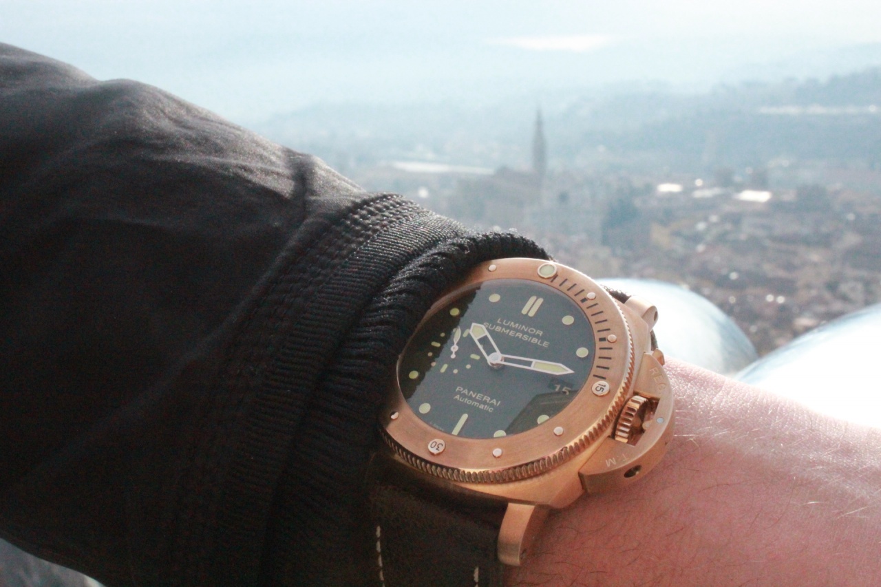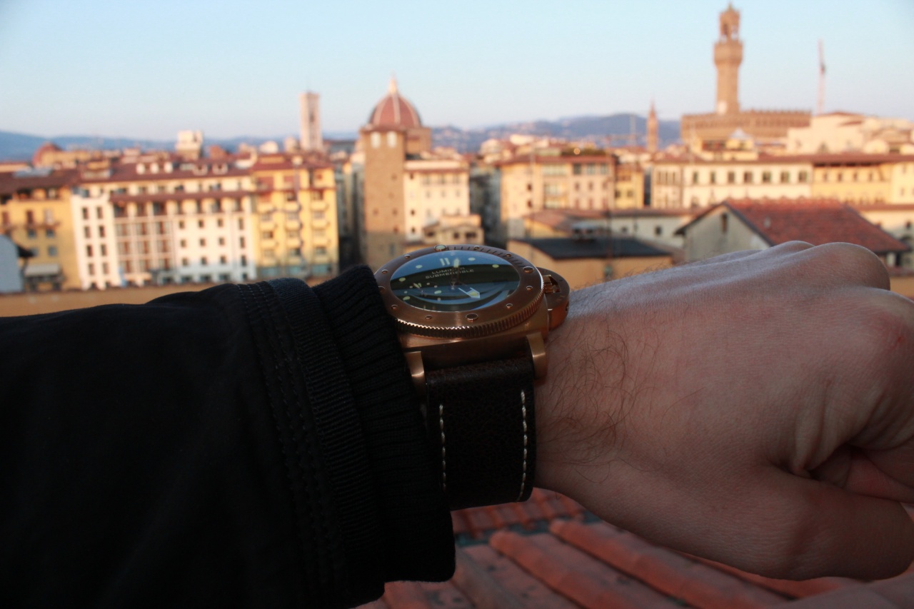 Действительно, 382-е (в Китае это сочетание цифр означает что-то вроде «жизнь полная богатства и процветания достижимого с легкостью», кстати, телефонный код Китая 68 – богатство и процветание, год основания марки panerai 1860 – дальше догадайтесь сами), судя по высказываниям на различных ресурсах, заметно разделили людей на пытающихся найти сто причин непрактичности данной модели и тех, кто был в восторге от нее, руководствуясь при этом полным отсутствием здравого смысла. Однако жизнь показала, что иррационалы (согласно соционике ими были и наш доблестный маршал Георгий Жуков и даже Наполеон Бонапарт) выиграли сражение. Даже законченный рационал сейчас бы не отказался прикупить данную модель по ритейлу:), но сейчас не об этом. Сейчас о том, насколько достойными, мужскими и утонченно стильными (в смысле точного соответствия определенному стилю, тематике, а не в смысле модными) получились эти часы. И я даже не буду ничего об этом писать и приводить разумные, обоснованные доводы. Лучше, просто, посмотрите сами. И да, они обязательно заржавеют:). С Паолой в бутике. Спасибо ей за брелок, книгу и футляр для часов, ну, и в первую очередь за часы, конечно. Вложение 221649Вложение 221648 Тем же вечером в гостинице. За рукой - Дуомо и Уффици. Во Флоренции желательно останавливаться на противоположном от Дуомо берегу, недалеко от Понте Векью или сразу за ним, поскольку с этой стороны реки лучше вид и больше приличных мест, где можно отметить покупку часов. На другом берегу вовсю господствуют законы тур. индустрии;). Вложение 221650Вложение 221651 Отмечание покупки. Фото, сделанное уже после поедания вкуснейшего bistecca fiorentina (мы даже не успели его сфотографировать:). За наводку по ресторану спасибо Денису, кому интересно это место - посмотрите подробнее на его сайте;). Кстати, для интересующихся могу дать пару-тройку подобных наводок по Флоренции и Риму, открытых в этот и предыдущие разы. Например, в 100 метрах от этого места расположен отличный двухзвездочный мишленовский ресторанчик Cammillo Trattoria. Деньги те же, еда немного поинтересней, не скажу вкуснее. Вложение 221652 Утром, в лучах зимнего тосканского солнца. Игра света на бронзе с учетом сложной формы часов просто завораживает. Вложение 221653 Вложение 221655Вложение 221654Вложение 221617 Вложение 221618 В дороге. Все правильно пишет Денис на своем сайте про Тоскану. Одно он упускает из виду, а именно то, что ничего так не сможет помочь понять и почувствовать это место, как передвижение на автомобиле. Это место просто напичкано старинными замками, виллами, горными лесами и серпантинами, разноцветными весной и присыпанными снегом зимой холмами, кипарисами, францисканскими монастырями, оливковыми рощами, виноградниками, горным воздухом, пропитанным ароматными травами, и прочим и прочим, чего никогда не увидеть и не осязать из окна поезда или оставаясь в пределах городских стен. А есть же еще придорожные закусочные на знаменитой дороге Кьянти, где черный петушок кричит вам на каждом шагу: «ну, выпей вина, ты же не дома, здесь нет треклятых гайцов:)». Вложение 221619Вложение 221628Вложение 221627 С купола Флорентийского Дуомо и внутри него. В Италии обязательно надо забраться, по крайней мере, на 5 высотных точек: купол Флорентийского Дуомо, сиенская башня Торре дель Манджа или смотровая стена в Сиенском Дуомо, Пизанская башня, купол собора Святого 