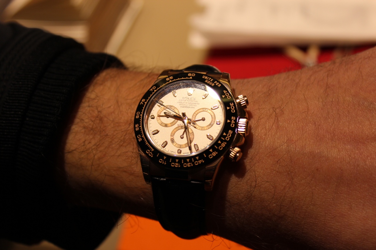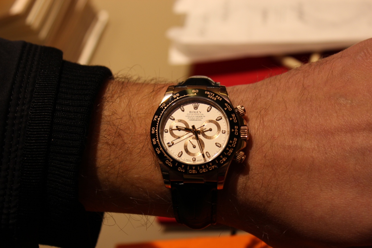 Здесь речь только о конкретной daytona, на чужих фото она показалась мне отличным костюмным вариантом, конкурентом patek philippe nautilus на ремне. Стальная, белозолотая - слишком скромный спорт (маленькая) и не под костюм (ИМХО). Green green rolex рушит хрупкий мир чувств и разума:) |