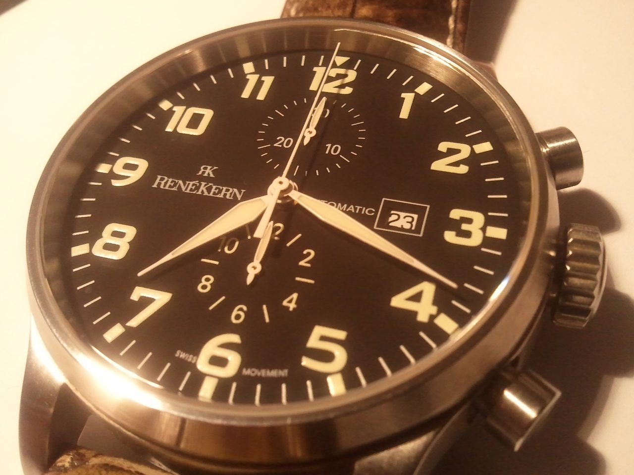 Хочу показать мои самые любимые часики - "пилотский" хронограф Рене Керн 6236-7750. Внутри швейцарский Вальжу 7750. Черный циферблатт с датой. Сапфировое стекло. Диаметер 47мм. Ремешек из кожи аллигатора.