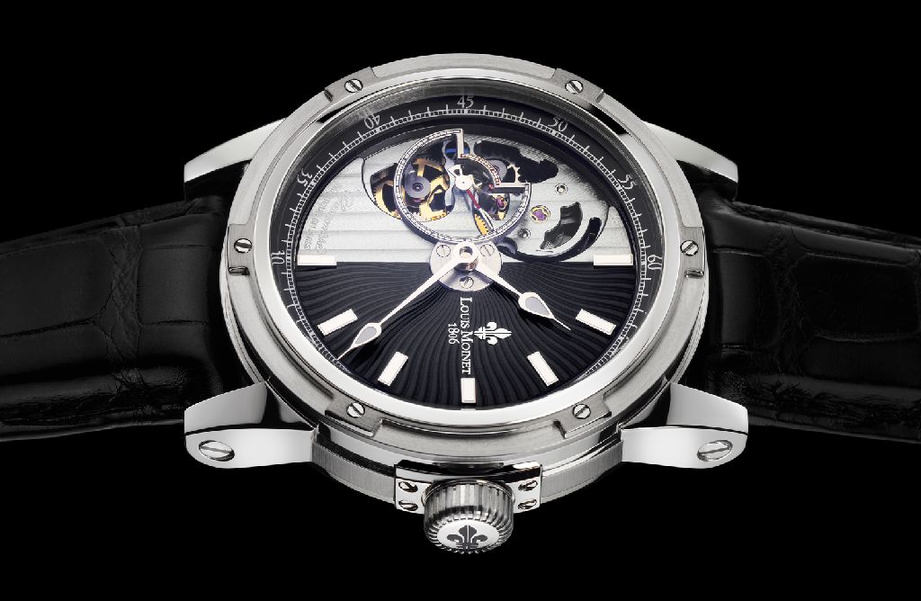 Круглый полированный корпус с фиксированным безелем на шестью винтах, диаметром 43,50 мм, толщиной 15,60 мм, водонепроницаемый до 50 метров. Сапфировое стекло установлено на передней стороне корпуса (с двусторонним антибликовым покрытием) и на его завинчивающейся задней крышке. Циферблат гильошированный, разделенный по вертикали: черного и серебристого цвета, на его левой стороне имеется крупная апертура, сквозь которую просматривается механизм. Модель оснащена автоматическим механизмом LM31, совместно разработанным и выпущенным компаниями Louis Moinet и Concepto, состоящим из 182 деталей, на 26 камнях, с балансовой частотой 28800 полуколебаний в час (4 гц), 48-часовым запасом хода, декорированным ротором автоподзаводом, установленным на высокотехнологических керамических шарикоподшипниках, функциями индикации часов, минут (посредством соответствующих центральных стрелок) и секунд (на 9 часах). Черный ремешок из кожи луизианского аллигатора, с раскладной застежкой. Лимитированный выпуск по 365 пронумерованных экземпляров каждой из четырех версий модели. Источник: http://www.horozima.com/2012/03/loui...urce=BP_recent |