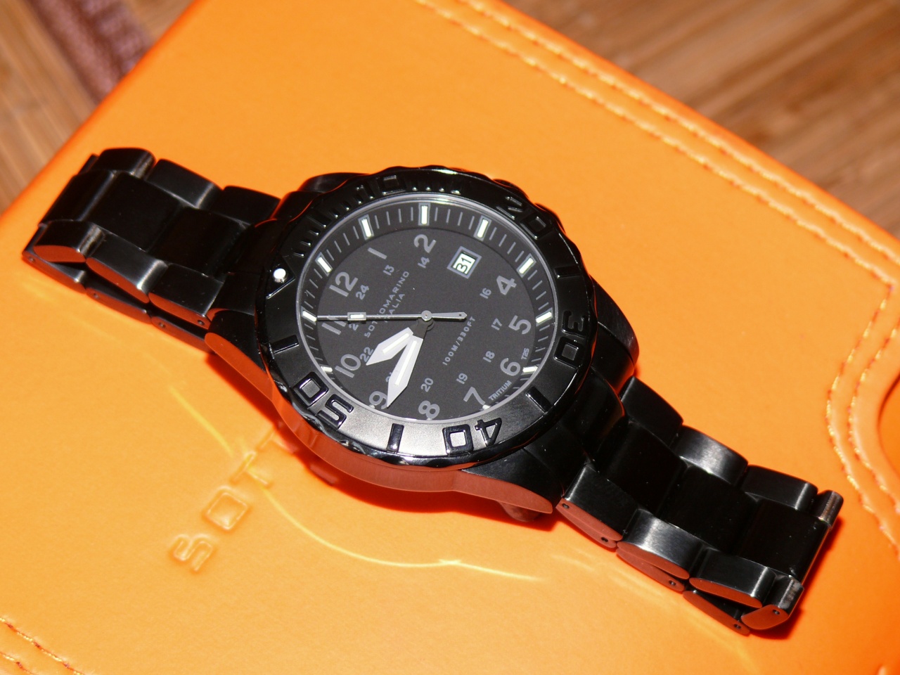 Добрый день или доброе утро всем форумчанам . Вашему вниманию хочу представить Sottomarino Lucciola с тритиевой подсветкой .Часы куплены у форумчанина , где то даже отзыв есть , хочу поделиться своими первыми впечатлениями. Часовой болезнью ранее не болел , вернее вообще не знал о существовании часов . А точнее телефон , в машине часы , в компьютере часы , везде часы.И вот как только исполнилось 40 прозрел )) Так как часы ношу не постоянно , связано с работой с красками и растворителями, то кварц основное требование.Начитавшись форума, естественно Сейко Кинетик , для меня это Тойота среди часов. Тойота для меня эталон надежности , функциональности , комфорта . По этому и Сейко )). Болезнь прогрессировала и вот уже у супруги Сейко с брюликами ))) Далее обострение и на 18 летие сына заказана Сейка спортура с будильником.потом были Раймонды , Милитаре , ну все вроде качественные часы . Ну а так как на весну совсем нет часов , да и зарплата далеко , то в глаза бросились часы неизвестной фирмы с завинчивающейся головкой ,тритиевой подсветкой ,сапфиром , вращающемся в одну сторону базелем , черным ПВД покрытием , датой ,большой секундной стрелкой , как я хотел , да еще и ценой в 150 уе, то брать или не брать вопрос не стоял .. Брать!!! Упаковка у часов неплохая , красивая оранжевая коробочка простроченная , с кнопкой . Из документов непонятные две бумажки , размером с билет на метро и шильдиком Sottomarino Lucciola.Общее впечатление от часов положительное. Стрелки четко попадают в метки. Я впервые увидел тритиевую подсветку , так как на сейко не тритий , и что могу сказать . Может я не понял что , но Сейко горит в темноте а эти не очень .. Может зарядить нужно , солнцем ) Посмотрим.На ощупь тяжелые качественные часы .Единственное что огорчило - это браслет. Браслет отвратителен во всем . В местах соединения звеньев браслета отсутствует напыление и видны , кстати сильно, желтого цвета металл . Это же присутствует и на ребрах ушек часов . Застежка браслета жидкая , фиксируется слабо .. То есть браслет напоминает то что продается во всех супермаркетах за 300 рублей. Но вообщем то часам за эту сумму простительно . Буду ставить каучук. Пока все впечатления . Позже дополню , если будет интересно Вам. Спасибо. Вложение 238952