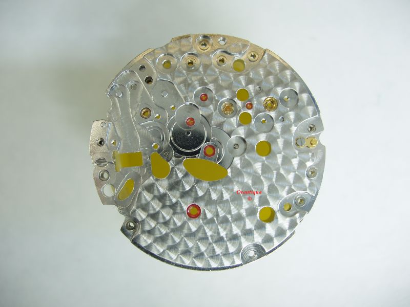 Вложение 245952 Вид механизма со стороны циферблата,снято часовое колесо, видны противоударные устройства KIF на осях баланса и анкерного колеса. Применение данного устройства для поддержки цапф анкерного колеса позволяет добиться снижения трения и лучшего удержания смазки. Вложение 245953 Снят ротор автоподзавода Вложение 245954 Снят мост автоподзавода, виды красные реверсивные колеса Вложение 245955 Блок автоподзавода снят полностью, под ним мост барабана и барабанное колесо Вложение 245956 Снят мост колесной передачи хронографа, на позиции "9часов" желтое колесо с сердечком - колесо минутного накопителя. В позиции "3часа" желтое колесо с сердечком - колесо часового накопителя. В центре - колесо секундной стрелки хронографа. В позиции "6часов" промежуточное колесо с вертикальной муфтой, через него идет передача мощности с часового механизма на механизм хронографа. Также внизу виден тройной молоточек сброса на "0" Вложение 245966 Сняты колеса хронографа, в центре - колесо из передачи между минутным и часовым накопителями. Также видно противоударное устройство KIF на оси анкерного колеса - признак высококлассного калибра. Вложение 245967 Сняты мост баланса и баланс, видна гайка регулировки высоты моста, с помощью которой добиваются оптимального осевого зазора оси баланса. Вложение 245968 Снят мост ангренажа(главной колесной передачи). Ангренаж имеет классическую компоновку с центрально расположенным минутным колесом. Размеры барабана максимально возможные при данной компоновке. Виден желтый рычаг хака, стальные рычаги пуска-стопа и фиксации колонного колеса. Внизу, в позиции "6 часов" секундное колесо, на его оси сидит маленькая сек. стрелка, обратите внимание на небольшой желтый триб на оси этого колеса - с него идет отбор мощности через промежуточное колесо с вертикальной муфтой сцепления на механизм хронографа. Вложение 245969 На платине остались только заводной вал с заводным трибом и кулачковой муфтой Вложение 245970 Платина со стороны циферблата |