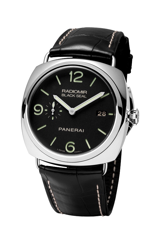 Корпус новых часов диаметром 45 мм выполнен из полированной стали и имеет чёрный циферблат «сэндвичной» конструкции. Это классическое решение отличается практичностью и высочайшей эстетикой: сочетание часовых маркеров и больших арабских цифр, малая секундная стрелка в положении «9 часов» и окошко даты в положении «3 часа». Задняя крышка выполнена из прозрачного сапфирового стекла, что позволяет наблюдать за работой механизма P.9000 и, в частности, за ротором, снабжающим энергией два заводных барабана. Калибр P.9000 часов Radiomir Black Seal 3 Days Automatic имеет диаметр 13¾ линий и толщину 7,9 мм. Колесо баланса совершает 28,800 колебаний в час. Помимо функций времени и даты, калибр P.9000 оснащается устройством быстрой установки часовой стрелки: особая шестерня с 12 зубцами и пружинная муфта позволяют переводить часовую стрелку вперёд или назад с шагом в один час, не вмешиваясь в ход минутной стрелки. Таким же устройством оборудован индикатор даты, которая автоматически переводится при преодолении часовой стрелкой полуночи, как при переводе часовой стрелки вперёд, так и назад. Часы Radiomir Black Seal 3 Days Automatic (PAM00388) поставляются на чёрном ремешке из кожи аллигатора, который крепится к корпусу на съёмных дужках (запатентовано Officine Panerai), позволяющих быстро сменить ремешок. Источник: http://watchpaper.ru/2012/04/panerai...ays-automatic/ |