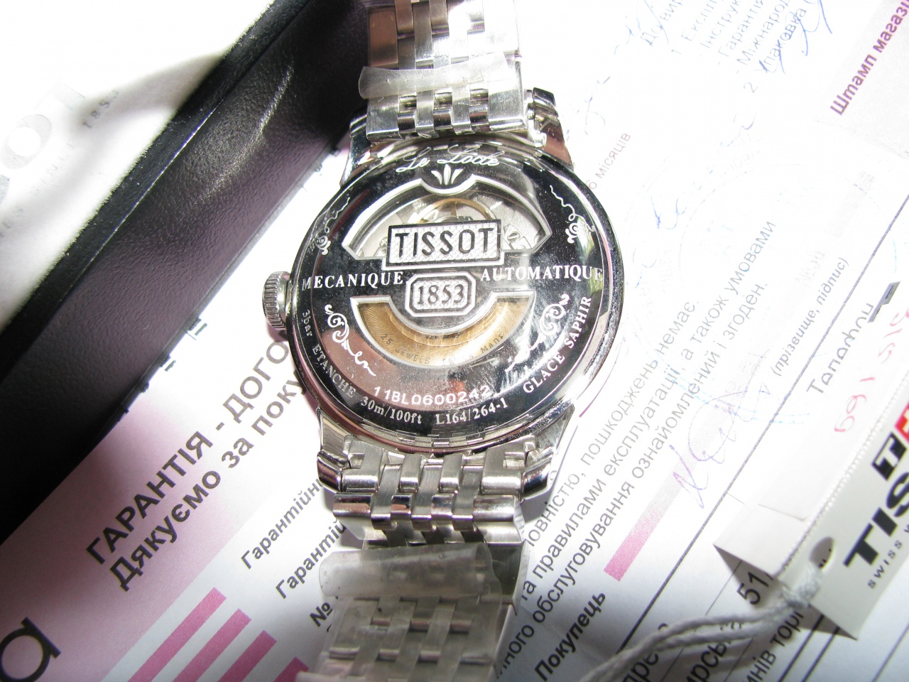 Доброго времени суток, уважаемые форумчане! Черт меня дернул изменить уважаемым мною и многими из вас японским производителям часов и погнатся за "громким именем" - купить часы швейцарской "фирмы" (читай зелепушной конторы) Tissot. Часы приобретены мною с целью подарить их за границей "незалежной державы", куда собираюсь лететь в отпуск прямо завтра. Т.к. выбранная модель, как я понял, очень популярна на подделку - решил брать в самом что ни на есть официальном магазине одной из старейших и, до недавнего времени, уважаемых торговых сетей (из темы и фотографий понятно какой). При покупке прежде всего смотрел на отсутствие "косяков", о которых много писали на этом форуме (стрелки, резанный "узор" на цифере, браслет, клейма на механизме), но, как говорится: "слона-то я и не приметил..":mad: Обратите внимание на восьмерку в логотипе "1853" и на "смазанный" кверху угол последней буквы "Т" в надписи "TISSOT". Сами часы 100% оригинал, при чем из свежей серии ( серийник уже выгроверован на задней крышке ). По вопросу обмена на аналогичную модель или возврата денег был мастерски водим неделю за нос торговыми работниками магазина, а в последний день перед вылетом мне заявляют, что деньги вернуть не могут, а по вопросу брака (который они в глаза не видят) обращайтесь в сервис центр. Вот такое "качаство", что швейцарских часов "фирмы" Тиссот, что обслуживание в "фирменных" магазинах "столицы юмора".