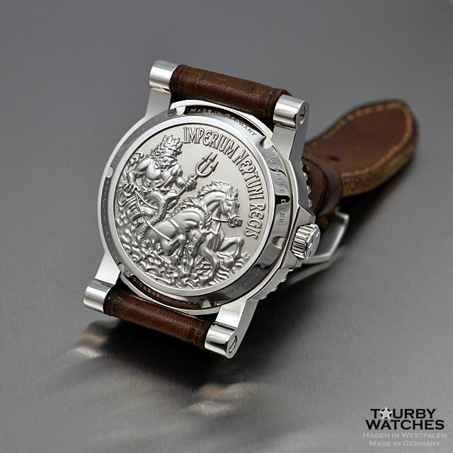 Круглый корпус из нержавеющей стали или из нержавеющей стали с черным DLC-покрытием, диаметром 45,5 мм, толщиной 16,0 мм, с расстоянием между дужками 24 мм, водонепроницаемый до 500 метров. Вращающийся однонаправленный дайверский безель. На торце защищенной завинчивающейся заводной головки, расположенной на 3 часах, имеется эмблема бренда. На завинчивающейся задней крышке выгравирован барельеф Нептуна с трезубцем, на колеснице. Сапфировое стекло с антибликовым покрытием защищает циферблат с накладными часовыми индексами и стрелками с белым люминесцентным покрытием. Модель оснащена швейцарским автоматическим механизмом ETA 2824-2, на 25 камнях, с функциями индикации часов, минут, секунд (посредством соответствующих центральных стрелок) и даты (в апертуре на 3 или на 6 часах), а также без последней функции. Поставляется на кожаном ремешке или на нейлоновом ремешке НАТО. MSRP модели составляет 1099 евро. Вложение 259252Вложение 259253 Вложение 259254Вложение 259255Вложение 259256 Источник: http://forums.timezone.com/index.php...=6157143&rid=0 |