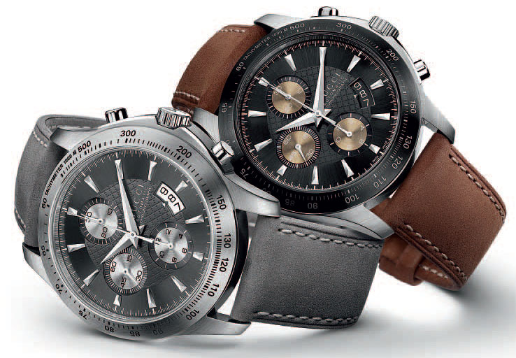 Новая модель G-Timeless Automatic Chronograph от бренда Gucci имеет круглый корпус из нержавеющей стали, диаметром 44 мм. Заводная головка, расположенная на 9 часах, частично утоплена. На фиксированном безеле из нержавеющей стали или из нержавеющей стали с черным PVD-покрытием, выгравирована тахиметрическая шкала. Сапфировое стекло защищает серый или черный циферблат, гильошированный в центральной его части, с накладными стальными часовыми индексами и стрелками.