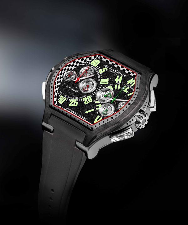 Швейцарская часовая компания DeLaCour представила специально для благотворительного аукциона Only Watch 2013 (о нем см. на нашем форуме здесь) свою новую уникальную модель Red Dots ("Красные точки"). Это название связано с дизайном модели, который выполнен в неортодоксальном спортивно-элегантном стиле, с красными точками на безеле, пушерах хронографа и на часовом корпусе. Последний изготовлен из титана с коррозионностойким PVD-покрытием. Циферблат, защищенный сапфировым стеклом, сложный многоуровневый, белого цвета, выстланый вертикальными полосками, с накладными часовыми индексами и стрелками (часовая и минутная - стальные скелетонизированные, остальные - красного цвета), покрытыми белым люминесцентным составом.