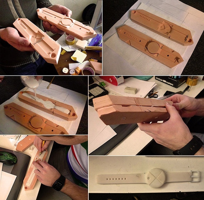 Часовой и минутно-секундный циферблаты уместились в двух секторах, расположенных друг напротив друга. Левый квадрант – вотчина жирной часовой стрелки, правый – обитель тощей секундной и минутной, похожей на кипятильник. В круглом окошке внизу показывается дата, верхний сектор декорирован изысканной гравировкой по силикону, надпись сделана такая: Art. Lebedev Studio. Ремешок выполнен из силикона, сидит на руке плотно и смирно – как и полагается ремешку из силикона. Корпус часов будет сработан из превосходного нержавеющего алюминия. Механизм кварцевый. Вложение 287976 Далее – фотографии отдельных этапов работы над часами. Сначала был такой вот уродец: Вложение 287977 Эскизы модели: Вложение 287978 Отливка макета: Вложение 287979 И еще один прототип: Вложение 287980 Источник: http://chronoscope.ru/2012/07/art-le...udio-sektorus/ |