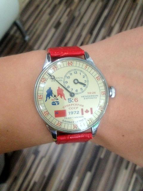 На местной инет-барахолке наткнулся на предложение вот таких часов. Утверждается, что ограниченная серия, выпущенная в честь серии матчей СССР-Канада в 1972 г. Вопрос, были ли такие выпущены или опять фейк? Адекватна ли цена в 7300 р за них?