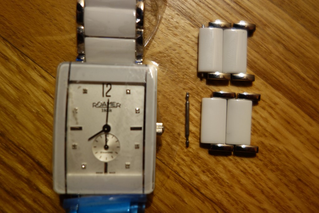 На женских керамических часах Roamer браслет собран с помощью пружинных штифтов. Стрелок на браслете нет.
