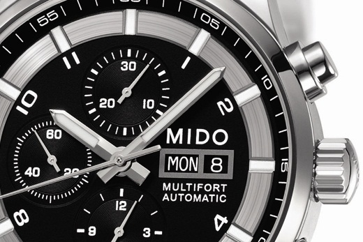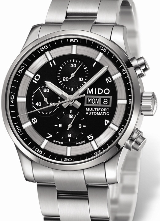 Дизайн новой модели Multifort Chronographe Automatique от швейцарского часового бренда Mido выполнен в спортивном стиле. Ее корпус круглый, из нержавеющей стали 316L, трехкомпонентный, диаметром 44 мм, толщиной 14,5 мм, водонепроницаемый до 100 метров. Сапфировое стекло установлено на передней стороне корпуса и на его завинчивающейся задней крышке. Циферблат черный, с арабскими цифрами и часовыми индексами (последние, а также часовая и минутная стрелки покрыты белым люминесцентным составом SuperLumiNova).