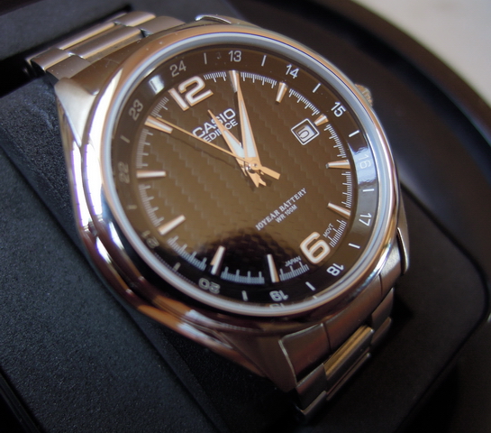 В итоге были куплены Casio EF-121D-1A - кварц, корпус и браслет из нержавеющей стали, водозащита 10Бар и долгоиграющая батарейка. Дизайн спокойный, с классическими линиями, что и требовалось. Немного современности и спортивности придаёт цифер "под карбон", на свету очень красиво играет. Ну и т.к. это Edifice то сомнений в надёжности и точности не возникает.