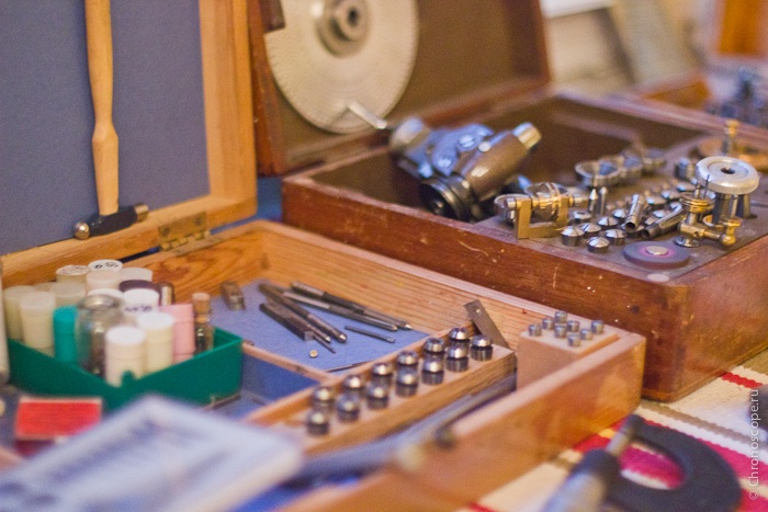 Прежде чем начать репортаж, оговоримся – корреспонденты журнала Chronoscope просто зашли к Валентину в гости, без особой цели. Однако фотоаппарат всегда с нами и мы не удержались от того, чтобы сделать несколько фотографий. Это не парадно-глянцевая съемка, а фотофиксация – поэтому и кадры такие «домашние». Ерофеев занимается всем, что связано с часами, но с особой радостью он берется за изготовление часов на заказ. Свои первые модели он создал на базе старинных калибров, которые подвергал чистке, дополнительной финишной отделке, некоторые детали механизмов ему приходилось изготавливать самостоятельно. Его первой работой стали массивные часы, сделанные по образу и подобию немецких летных хронографов времен Второй мировой войны. Вложение 320807 На создание корпуса ушло около месяца, в качестве материала использовалась каленая нержавеющая сталь и немагнитная нержавеющая сталь. Сбоку видно, что он разделен на две части тонким кольцом – это уже обычная сталь, которая со временем потемнеет. Ржавчина должна придать часам еще более брутальный вид. Вложение 320808 Внутри – механизм с функцией хронографа, изготовленный из старого советского калибра ЧК-6, разработанного усилиями исключительно советских инженеров. Аббревиатура ЧК – расшифровывается как «часы карманные», никакой связи с чекистами нет. Вложение 320809 Традиционная фотография с редакционным «таймексом». Размер часов понятен. Вложение 320810 Еще одна модель – однострелочник. Работая над часами, Ерофеев примерно определил границы своего стиля: минимализм, мужественность, фактурные материалы. Вложение 320811 На часах – ровно 10 часов. «Окошко» стрелки нависает над текущим часом, в то время, как острие указывает на минуты. Цена деления на шкале, сделанной по периметру циферблата, составляет 10 минут. Монументальный циферблат выполнен из валлийского сланца, круглые метки шкалы – металлические, пятна ближе к центру – естественного происхождения. Стрелка отделана в технике черной полировки. Вложение 320812 Внутри старинный механизм конца XIX века. Валентин долго восстанавливал его – самостоятельно изготовил часть винтов, нашел новую волосковую пружину, переделал несколько мостов. Вложение 320813 Мастеру нравятся стрелки с «яблоками», скорее всего они станут частью его фирменного стиля. Вложение 320814 Вложение 320815 Все эти работы производились на самых простых часовых инструментах. Некоторые из них Ерофееву продавали знакомые часовщики, некоторые он находил на обанкротившихся российских предприятиях. Вложение 320816 Вложение 320817 Вложение 320818 Но помимо сверл и отверток ему удалось приобрести уникальный аппарат – станок Hauser, купленный в прошлом веке для нужд советской часовой промышленности. По тем временам такая машина стоила больше сотни тысяч долларов. Теперь она стоит в мастерской у Ерофеева. Это оборудование позволило ему самостоятельно создавать детали, требующие повышенной точности. Вложение 320819 Вложение 320820 Параллельно он закупает за рубежом сырье. Вот, например, сталь Sandvik, купленная через интернет. Вложение 320821 Так же, не выходя из дома, можно купить и механизм для новых часов. Вложение 320822 Но самое главное заключается в том, что Валентин Ерофеев не просто переделывает старые механизмы и вставляет их в новые корпуса, у него полным ходом идет работа над собственным турбийоном. Первые