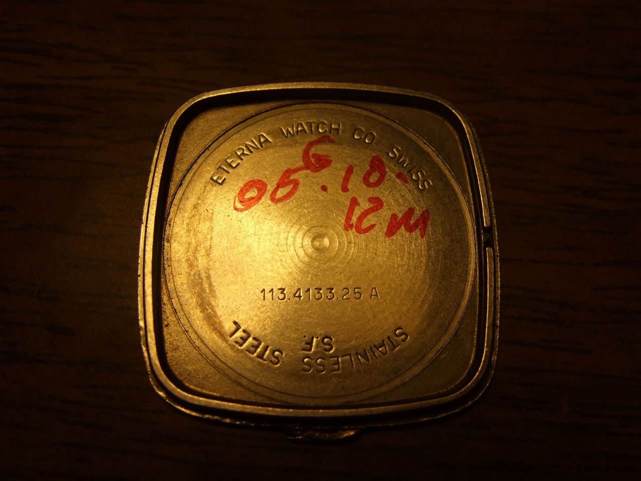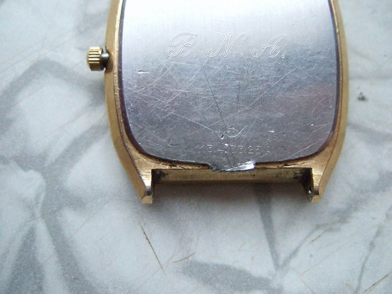 Извините, пока не получается сделать фото задней крышки получше. Там внизу эмблема рыбки и номер, повторяющийся с внутренней стороны крышки 113.4133.25 А . И инициалы предыдущего владельца, видимо... Ремешок не оригинальный, естественно, так первый попавшийся. Кстати, это одна из причин почему хочу опознать модель - подобрать похожий ремешок.