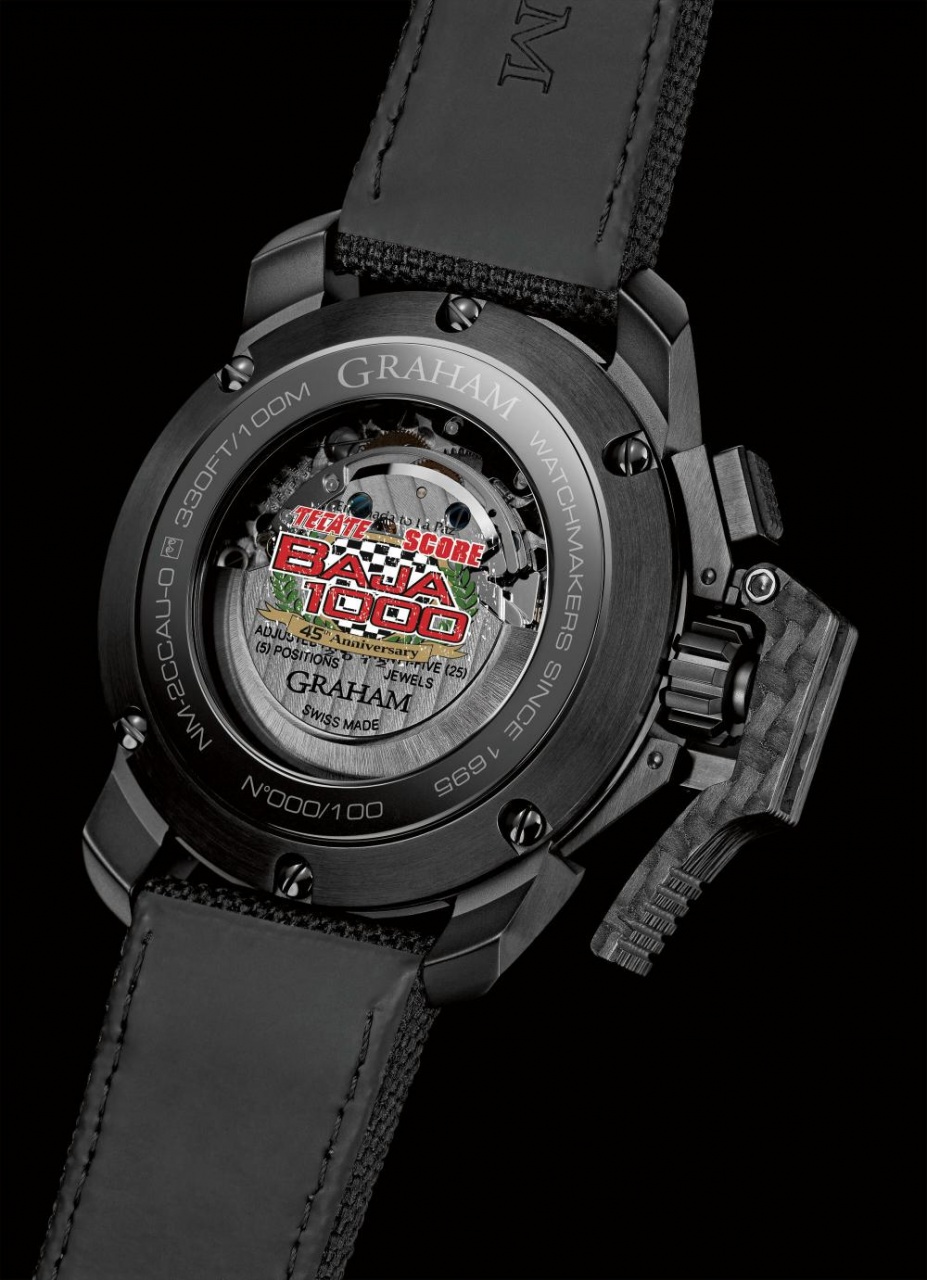 Новая лимитированная модель Chronofighter Oversize Score Baja 1000 от британской часовой фирмы, выпускающей свои часы в Швейцарии, Graham London имеет круглый корпус из нержавеющей стали с черным PVD-покрытием, диаметром 47 мм, водонепроницаемый до 100 метров. Гладкий фиксированный керамический безель. Заводная головка и хронографические пушеры расположены на левой стороне корпуса. Сапфировое стекло установлено на передней стороне корпуса (с антибликовым покрытием) и на его завинчивающейся задней крышке. Матово-черный циферблат с арабскими цифрами, часовой и минутной стрелками, покрытыми люминесцентным составом бежевого цвета. На периферии циферблата имеется круглая тахиметрическая шкала.
