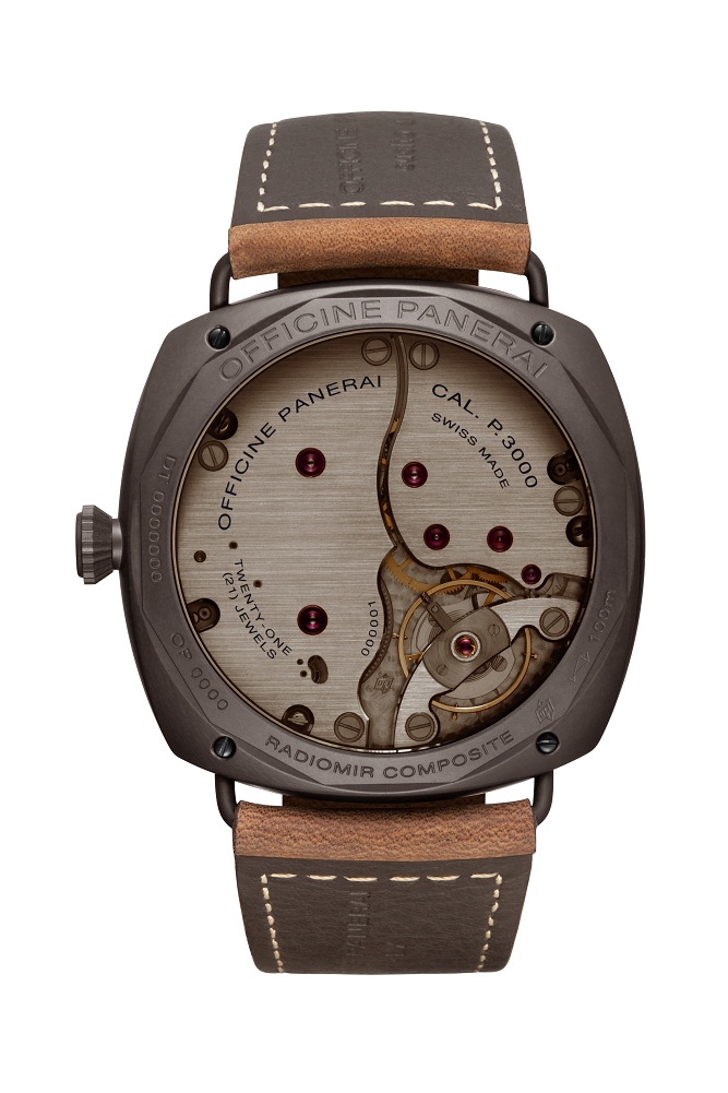 Через заднюю крышку из сапфирового стекла можно наблюдать работу великолепного механизма часов Radiomir Composite® 3 Days – эксклюзивного калибра с ручным заводом P.3000. Он обладает трехдневным запасом хода, что достигается двумя заводными барабанами, соединенными последовательно. Механизм украшен большими отполированными мостами со снятыми вручную фасками, его облик дополняет большое колесо баланса (13.2 мм), которое колеблется с частотой 3Гц. Калибр P.3000 также оснащен устройством, позволяющим переводить часовую стрелку с шагом в один час без использования минутной стрелки, что позволяет не нарушать точность хода часов при переводе часа.