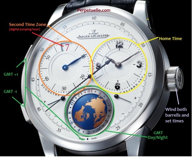 Модель оснащена мануфактурным механизмом с ручным заводом Jaeger-LeCoultre 383, который фактически состоит из двух калибров, каждый из которых имеет собственный заводной барабан (их завод производится одной заводной головкой в разные стороны, по часовой или против часовой стрелки, для разных барабанов). Первый калибр поддерживает функции индикации местного времени, а второй - времени второго часового пояса. Каждый калибр на 54 камнях, с балансовой частотой 28800 полуколебаний в час (4 гц), 50-часовым запасом хода. Функции: аналоговая индикация местного времени (на циферблате, расположенном на 2 часах), индикация времени второго часового пояса (цифровой указатель часов в апертуре и минутная стрелка на циферблате, расположенных на 10 часах), индикация дня/ночи (на круглом указателе в виде земного шара, вместе с разметкой часовых поясов), а также индикация запаса хода каждого из двух калибров (аналоговые указатели на 4 и 8 часах). Механизм Jaeger-LeCoultre 383 изготовлен, собран, а также отменно отделан и декорирован вручную.