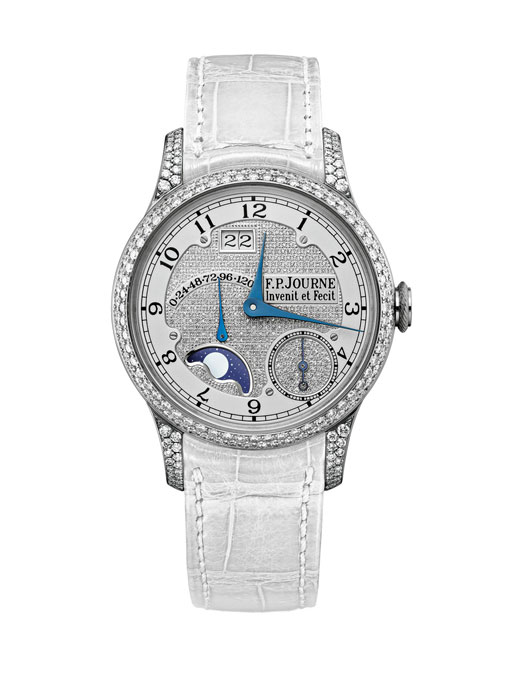 Парные часы линии Octa Divine представлены маркой F.P.Journe и могут стать превосходным подарком в честь Дня всех влюбленных. Модель для нее представляет собой часы в платиновом корпусе диаметром 36 мм, инкрустированном бриллиантами общим весом 2,86 карата. Циферблат из белого золота. Автоматический механизм из 18К розового золота с романтическим усложнением – индикатором фаз луны. Резерв хода 120 часов. Белый ремешок из кожи аллигатора. Модель для него – Octa Divine в платиновом корпусе с индикацией фаз луны. Циферблат из белого золота. Автоматический механизм из 18К розового золота с резервом хода 120 часов. Черный ремешок из кожи аллигатора. Источник: http://watchyourtime.net/europe/fpjourne.html |