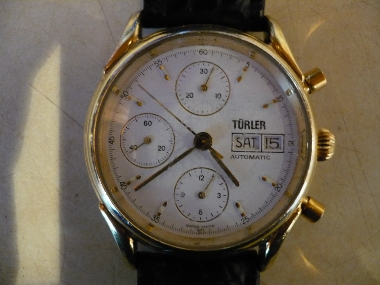 Доброго всем дня! Достались от хорошего человека часы Türler? хотелось бы узнать информацию про марку, брэнд. Не получается выложить фото часов, так что, пока могу только дать внешнее описание. Часы автомат, написано swiss made. на циферблате три стрелки, видимо что то типа хронографов, сбоку две кнопки, одна точно фиксирует секундную стрелку, а другая выставляет её на 12. между ними, штырёк для установки даты и дня недели. Прошу простить за мой не грамотный часовой язык и скудное описание, но фото не знаю как прикрепить.