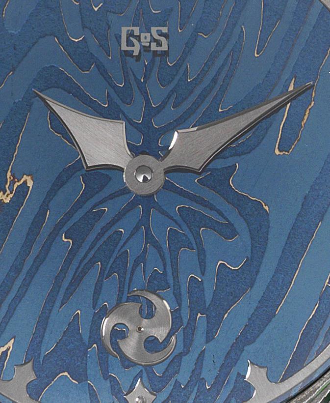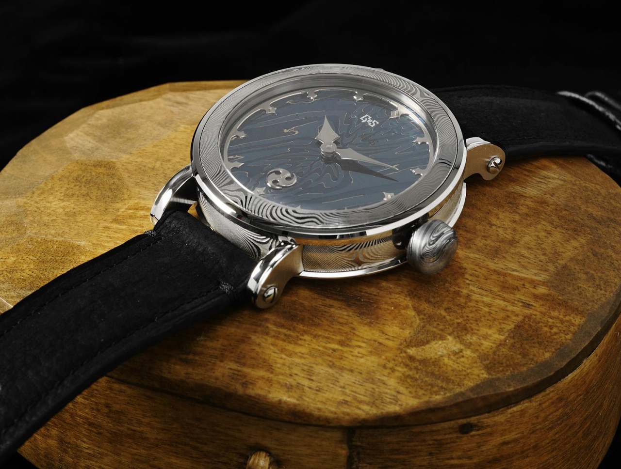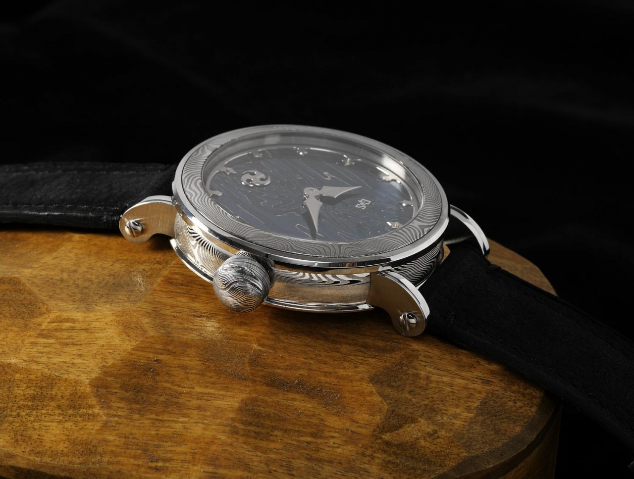 Новинка имеет круглый полированный корпус из дамасской стали, диаметром 45,0 мм, толщиной 10,0 мм, с 22-миллиметровым расстоянием между дужками, водонепроницаемый до 100 метров. Заводная головка, диаметром 9 мм, располагается на 3 часах. Плоское сапфировое стекло установлено на передней стороне корпуса (с антибликовым покрытием) и на его завинчивающейся задней крышке. Циферблат ручной ковки выполнен также из дамасской стали; расположенное на периферии циферблата кольцо с часовыми индексами, так-же, как и стрелки, выполнены из вручную отполированного белого золота.