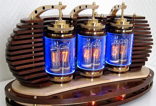 Корпус часов изготовлен из клёна и грецкого ореха и изобилует различными латунными трубками и зубчатыми колесами, представляя собой потрясающую смесь стилей арт-деко, стимпанка и индастриала. Индикация времени осуществляется при помощи старинных российских цифровых ламп с голубой светодиодной подсветкой. Эти потрясающие часы не только показывают время, но и имеют функцию будильника. Стоимость настольных часов Lamina Nixie Clock составляет $1500. Источник: http://www.luxplanet.ua/chasy_aksess...28122012113000 |