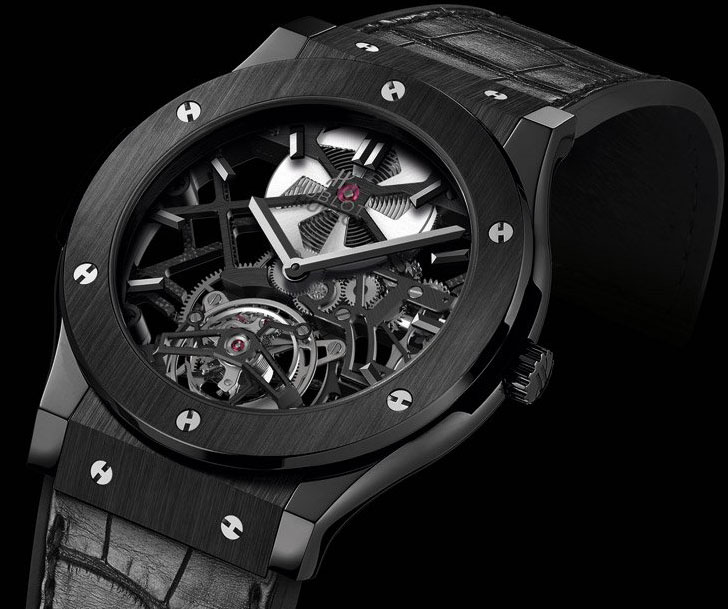 Швейцарская часовая компания Hublot представила свою новую лимитированную модель Classic Fusion Skeleton Tourbillon Black Ceramic.