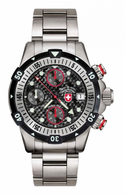 Модель Swiss Military 20,000 Feet Diver является сегодня самыми глубоководными часами в мире. Важно отметить, что это не просто автоматические часы, а хронограф, водозащита которого всегда была серьезной проблемой из-за дополнительных отверстий в корпусе.