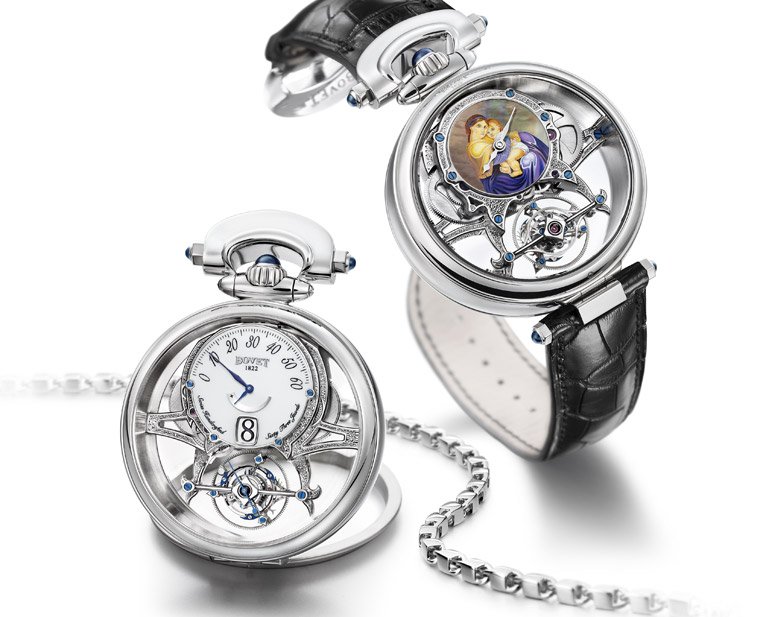 Новинка имеет круглый корпус, изготовленный из 18-каратного розового или 18-каратного белого золота, диаметром 45,00 мм, толщиной 16,45 мм, водонепроницаемый до 30 метров, конструктивно выполненный в форме AMADEO®Convertible (позволяющей трансформировать модель либо в наручные часы, либо в настольные часы, либо в карманные часы). Заводная головка, с синим сапфировым кобошоном, расположена на 12 часах. Сапфировое стекло установлено на лицевой стороне корпуса и на его задней крышке. Циферблат, как таковой, отсутствует; на 12 часах имеется малый децентрализованный двусторонний циферблат. Модель оснащена мануфактурным швейцарским механизмом с ручным заводом Dimier 16BM02AI-HSMR, состоящим из 439 деталей, на 65 камнях, с балансовой частотой 21600 полуколебаний в час (3 гц), 5-дневным запасом хода, функциями индикации часов, минут -посредством соответствующих центральных стрелок на малом децентрализованном циферблате с изображением Мадонны с ребенком на руках; а также, посредством цифрового часового указателя в апертуре, расположенной на 6 часах, и ретроградной минутной стрелки - на обратной стороне малого децентрализованного циферблата над задней стороной калибра. На последнем имеется, также аналоговый указатель запаса хода. Секундная стрелка находится на круглой каретке минутного турбийона, расположенного на 6 часах. Поставляется на ремешке из кожи аллигатора с застежкой из 18-каратного розового или 18-каратного белого золота, а также с соответствующей золотой цепочкой. Лимитированный выпуск по 50 экземпляров в розовом и белом золоте. Источник: http://journal.hautehorlogerie.org/e...-fitting-4235/ |