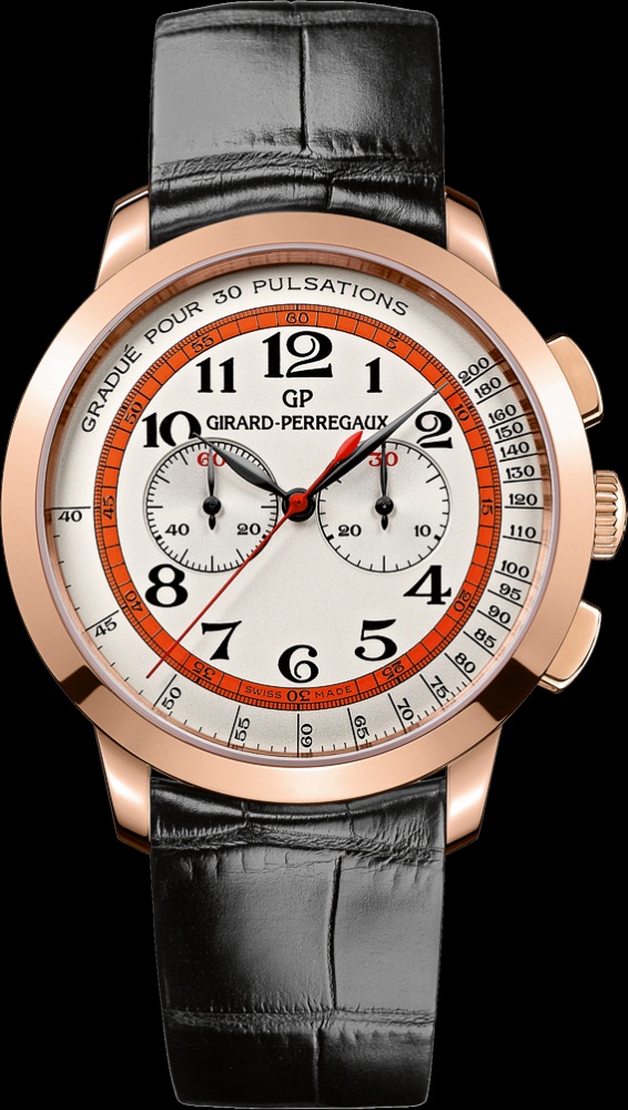 Круглый полированный корпус, диаметром 40 мм, с заводной головкой, расположенной на 3 часах, пушерами хронографа - на 2 и 4 часах. Сапфировое стекло защищает молочно-белый циферблат с напечатанными черными арабскими цифрами, круглой минутной шкалой, выполненной в оранжевом цвете, круглой пульсометрической шкалой, размещенной на периферии циферблата. Модель оснащена мануфактурным швейцарским автоматическим механизмом Girard-Perregaux GP030C0, с функциями индикации часов, минут (посредством соответствующих центральных стрелок), секунд (на малом боковом циферблате, расположенном на 9 часах), а также с хронографом (центральная секундная стрелка оранжевого цвета и 30-минутный счетчик, расположенный на 3 часах). Поставляется на черном ремешке из кожи аллигатора с застежкой из 18-каратного розового или 18-каратного белого золота. Лимитированный выпуск по 10 экземпляров в 18-каратном розовом и в 18-каратном белом золоте. Вложение 405605Вложение 405606 Вложение 405607 Оригинальная модель "докторских часов" 1949 года выпуска: Вложение 405608 Источник: http://blog.perpetuelle.com/watches/...ch-for-dubail/ |