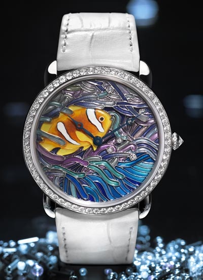 Включения эмали между тонкой проволокой, словно изящные и нежные линии карандаша, играют со светом. К столь утонченной технике Cartier добавили перламутровый рисунок в виде рельефной рыбы. Яркий цитрусово-оранжевый цвет и графический стиль придали циферблату еще большее качество. Кажется, будто круглый корпус этих часов, словно иллюминатор, открывает нам красоты подводного мира. С технической точки зрения часы также великолепны, как и по дизайну. Корпус из 18-каратного белого золота с родиевым покрытием усыпан 61 бриллиантом общим весом 1,57 карат. Бриллиантом украшена и головка подзавода. Циферблат Cartier Fish изготовлен из 18-каратного белого золота с выгравированным перламутром, миниатюрной рыбкой и кораллами из витражной эмали, а также 6 бриллиантами общим весом 0,02 карата. Часы Cartier Fish оснащены мануфактурным механизмом с ручным подзаводом – калибром 430 MC. Водонепроницаемость новинки – 30 метров. Выпущенные лимитированной серией в 30 индивидуально пронумерованных экземпляров, часы комплектуются ремешком из кожи аллигатора с двойной регулируемой застежкой из родированного 18-каратного белого золота с вставкой 43 бриллиантов весом 0,42 карата. Источник: http://watchpaper.ru/2013/04/cartier-fish/ |
