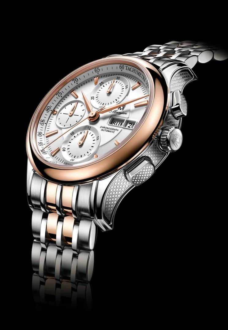 У новинки круглый корпус из нержавеющей стали с фиксированным позолоченным (18-каратным розововым золотом) безелем, диаметром 41 мм, водонепроницаемый до 50 метров. На торце рифленой заводной головки, расположенной на 3 часах, имеется логотип бренда. Сапфировое стекло установлено на лицевой стороне корпуса и на его завинчивающейся задней крышке. Циферблат объемный, молочно-белого цвета, с накладными позолоченными часовыми индексами и стрелками. На фланце размещенна круглая тахиметрическая шкала. Модель оснащена легендарным швейцарским автоматическим механизмом ETA Valjoux 7750, на 25 камнях, с балансовой частотой 28800 полуколебаний в час (4 гц), 40-часовым запасом хода, функциями индикации часов, минут (посредством соответствующих центральных стрелок), секунд (на малом боковом циферблате, расположенном на 9 часах), дня недели и даты (посредством соответствующих буквенного и цифрового указателей в сдвоенных апертурах, расположенных на 3 часах), а также с хронографом (центральная секундная стрелка, 30-минутный счетчик, расположенный на 12 часах и 12-часовый счетчик, расположенный на 6 часах). Калибр официальнно сертифицирован COSC (Contrôle Officiel Suisse des Chronomètres) в качестве хронометра. Поставляется на биколорном (нержавеющая сталь/позолоченная нержавеющая сталь) браслете с раскладной застежкой. Лимитированный выпуск 288 экземпляров. Источник: http://forums.timezone.com/index.php...=0#msg_6493867 |