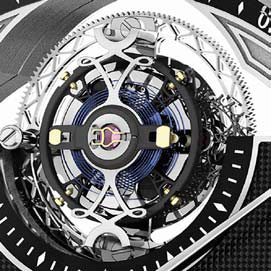 Круглый корпус, диаметром 41 мм, толщиной 10,5 мм, водонепроницаемый до 50 метров. Сапфировое стекло установлено на передней стороне корпуса и на его задней крышке. Циферблат скелетонизированный (в ювелирном варианте - полностью инкрустированный бриллиантами), с воронеными стрелками. Модель оснащена вручную скелетонизированным швейцарским автоматическим механизмом MHVJ (Manufacture Valle de Joux) L152, на 23 камнях, с балансовой частотой 28800 полуколебаний в час (4 гц), запасом хода 52 часов, функциями индикации часов (на децентрализованном малом циферблате на 12 часах), минут (посредством центральной стрелки). Турбийон расположен в апертуре на 12 часах. Калибр официально сертифицирован в обсерватории Безансона (l'Observatoire National de Besançon), в качестве хронометра. Поставляется на черном ремешке из кожи аллигатора с золотой застежкой из 18-каратного розового или белого золота. MSRP модели, в зависимости от варианта, начинается с 159900 евро. Источник: http://forums.timezone.com/index.php...=0#msg_6344219 |