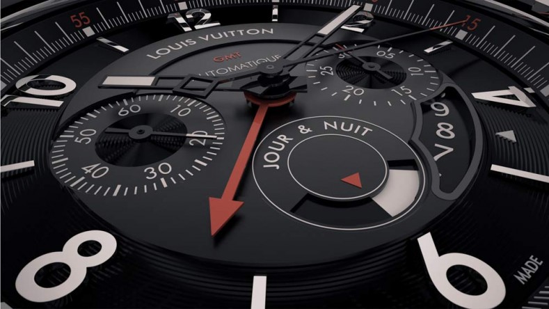 У новинки круглый корпус, изготовленный из нержавеющей стали, диаметром 43 мм, водонепроницаемый до 100 метров. Черный фиксированный безель выполннен из MMC. На торце рифленой заводной головки, расположенной на 3 часах, имеется вставка из MMC, на которой выгравирован логотип бренда Louis Vuitton. Сапфировое стекло установлено на передней стороне корпуса и на его завинчивающейся задней крышке. Циферблат многоуровневый, гильошированный, черного цвета, с накладными арабскими цифрами, часовыми индексами, часовой и секундными стрелками, покрытыми люминесцентным составом белого цвета. На фланце размещена круглая шкала с секундной разметкой.