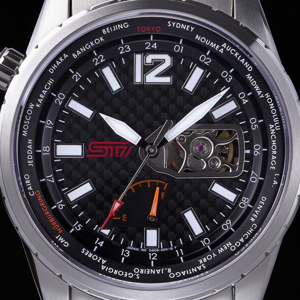 На фронтальной части часы показывают время в различных частях света - по окружности присутствуют названия 24 крупных городов мира с красочными акцентами на Токио и Нюрбургринге. Прозрачные вставки с обеих сторон позволяют заглянуть во внутренний мир часов, где некоторые механизмы имитируют работу поршня в оппозитном, фирменном двигателе Subaru.