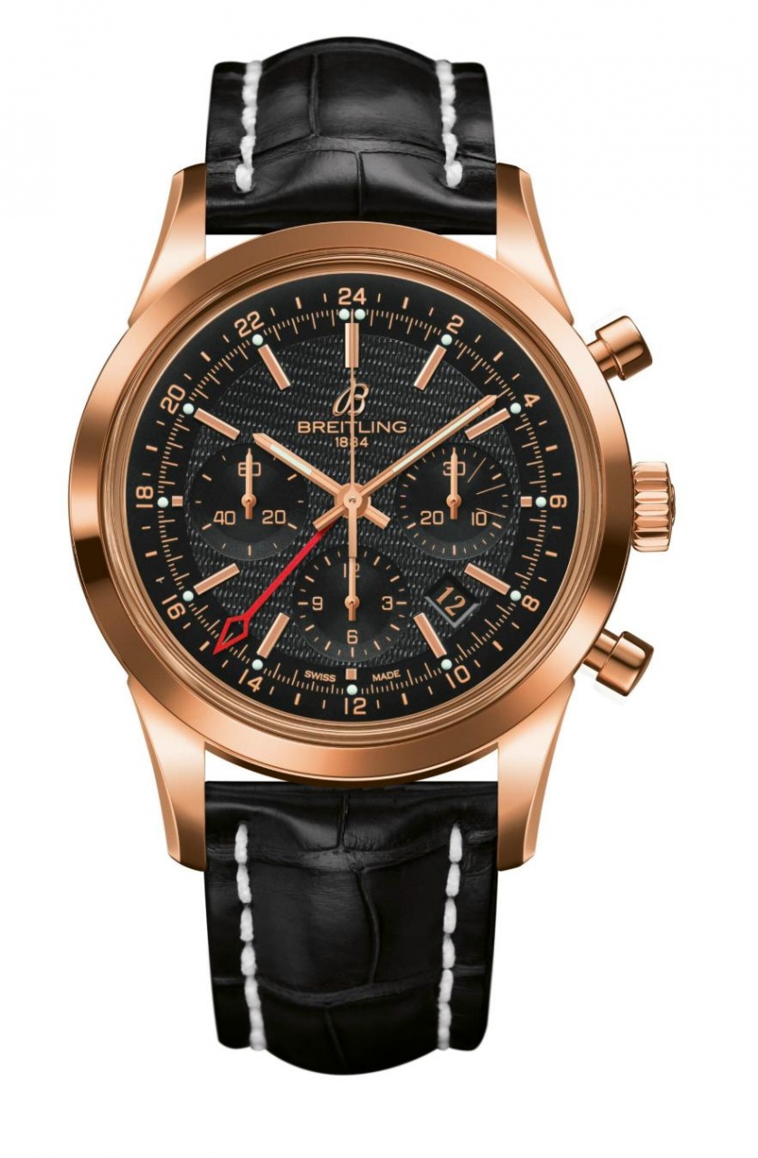Новая модель Transocean Chronograph GMT от швейцарской часовой компании Breitling имеет круглый полированный корпус, изготовленнный из 18-каратного розового золота или из нержавеющей стали, диаметром 43 мм, водонепроницаемый до 100 метров. На торце рифленой заводной головки, расположенной на 3 часах, выгравирован логотип бренда Breitling. Сапфировое стекло установлено на передней стороне корпуса (с антибликовым покрытием) и на его завинчивающейся задней крышке. Циферблат матово-черного или серебристого цвета, гильошированный в его центральной части, с накладными часовыми индексами, часовой и минутной стрелками (золотыми или стальными), с белым люминесцентным покрытием.