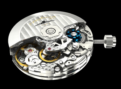 Новый калибр, ETA A08.231, будет представлен в новой модели Longines на выставке Baselworld-2009. Голубое колонное колесо видно на фото механизма. Источник |