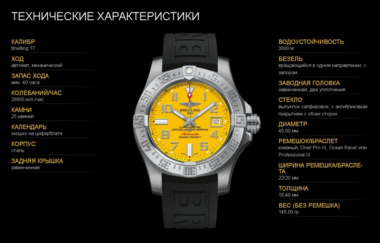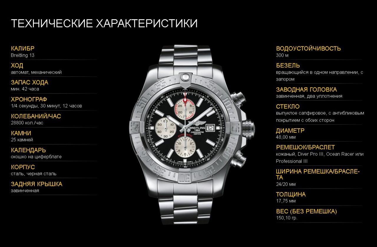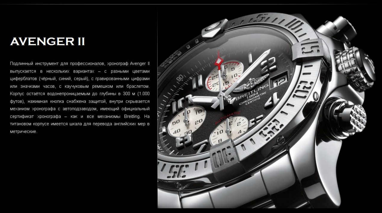Серия Avenger была создана компанией Breitling, чтобы предложить покупателям максимальную надежность. Особо надежная конструкция с поперечными усилителями обладает максимальной ударопрочностью. Многофункциональность большой завинчивающейся заводной головки. Максимум читабельности благодаря утолщенному антибликовому сапфировому стеклу и увеличенным стрелкам, цифрам и часовым меткам.